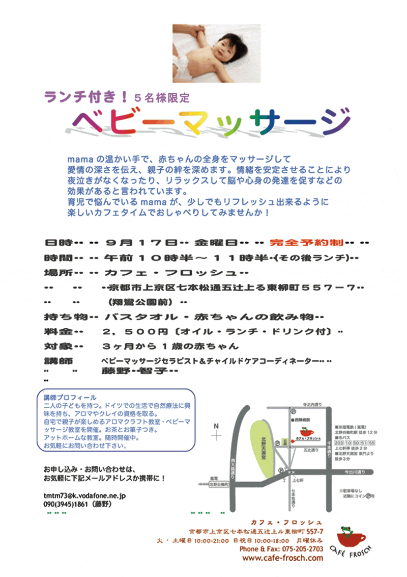The instructor led full body baby massage will bring relaxation to both mother and child and work to deepen the bond between the two. It is even said that this sort of massage can lessen night time crying bouts and create a more relaxed nature in the infant.