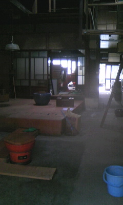 5月1日、オープン当日の早朝。夜通し作業していたフローリングの最後の塗りが仕上がりました。なんとか店舗の前半分だけですが、オープンする事が出来ました!renovation2