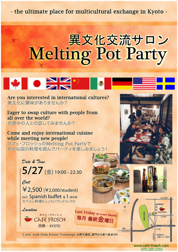 お待たせしました!異文化交流のためのインターナショナルパーティ「Melting Pot Party」が始まります!おいしい料理を楽しみながら、英語・日本語が飛び交う楽しいひとときを過ごしませんか? Froschのグローバルなスタッフも参加します。毎月最終金曜日に開催予定です。 今月のお料理は、週末グローバルランチで活躍中のMayaによる本場スペイン料理のビュッフェ!お見逃しなく! 19:00 - 22:30 2500円(学生2000円) (スペイン料理のビュッフェ+1ドリンク付) <要予約>