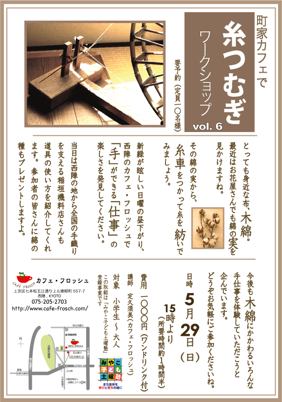 「 綿(わた)から糸つむぎ」ワークショッップ -Vol.6- 身近な素材「木綿」の糸を紡いでみましょう カエル妹 の「手仕事」ワークショップ第6弾! ご近所の老舗「稲垣機料店」 さんも全面バックアップ! 午後3時〜(所要時間約1時間半) 参加費1,000円(ワンドリンク付) 対象:小学生〜大人 <要予約>(定員10名様)