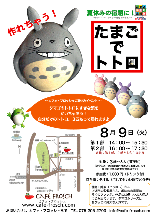 たまごでトトロをつくろう! おまたせしました!昨年大好評だった、「たまごでトトロ」が、今年も開催されます。 ご近所の散髪屋さんが教えて下さる、卵の殻を使って作るトトロ。カフェ・フ ロッシュにも飾らせていただいてます。好きな色に塗りましょう! トトロ3匹 持って帰れまーす! 第1回 - 14:00 〜 第2回 - 16:00 〜 対象:3歳以上(小学校低学年以下のお子さんは、保護者の方の付き添いをお願いします)